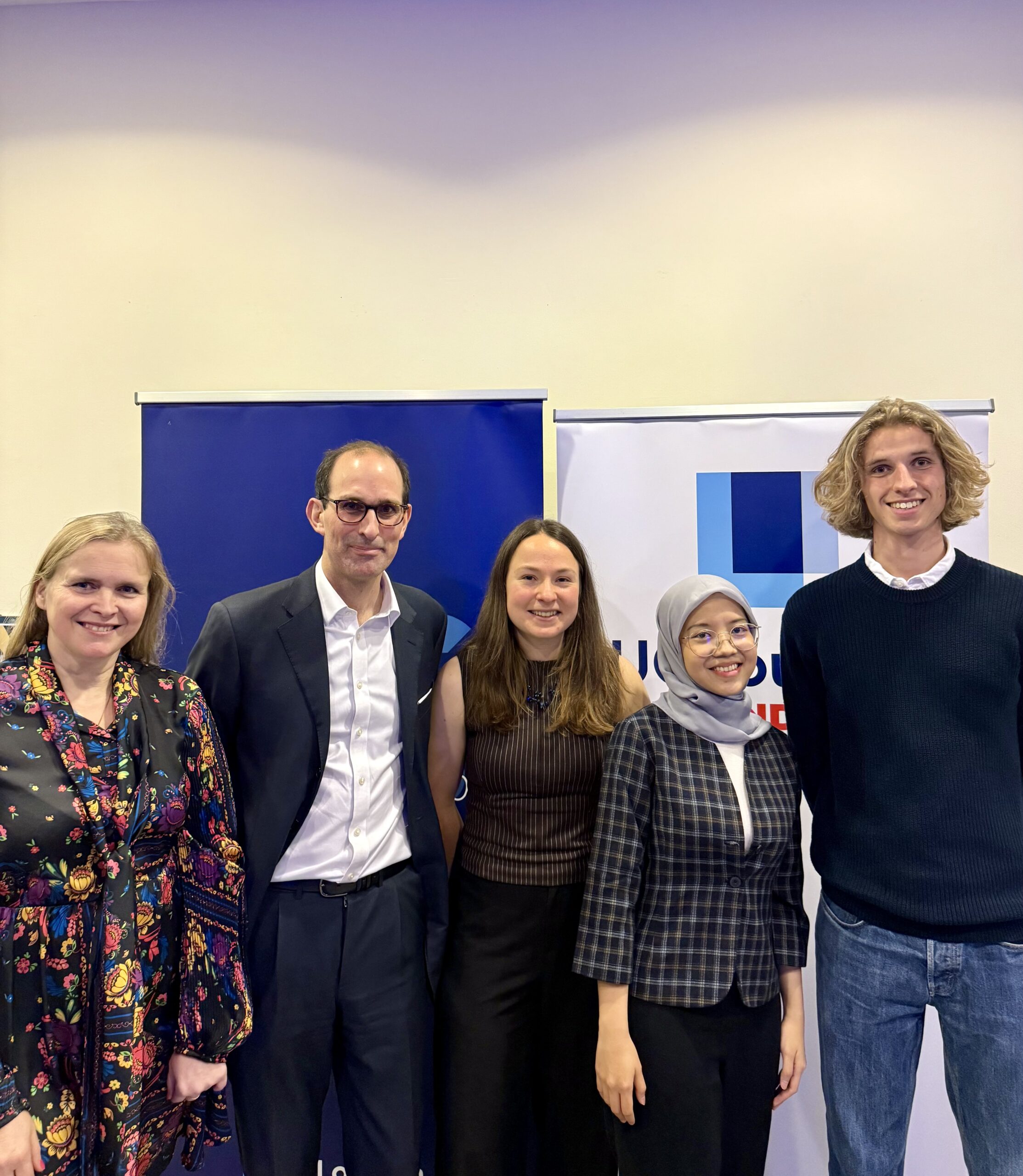 From the left to the right: Valérie Swaen (coordinator of the Philippe de Woot Award), Chuck de Liedekerke (2026 guest speaker, Founder and CEO of Soil Capital and Philippe de Woot’s grandson), Maria Belpaire, Putri Nabilah and Julien Chouak (the three 2026 nominees).